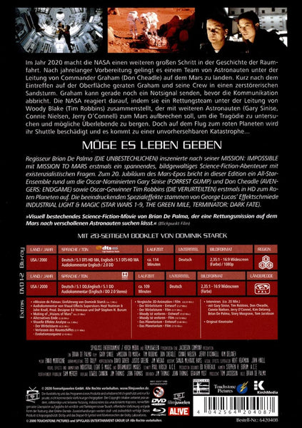 Das Mediabook enthält umfangreiches Bonusmaterial: - Booklet mit dem Essay "Mission de Palma" von Dominik Starck - Audiokommentar von Visual Effects Supervisors Hoyt Yeatman & John Knoll, Prod. Designer Ed Verreaux und DoP Stephen H. Burum - Making of "Visions of Mars" (ca. 21 Min.) - Alternatives Ende (ca. 11 Min.) - Visuelle Effekte Analyse: Der Wirbelsturm, Verlassen des Raumschiffes, Evolutionssequenz (ca. 5 Min.) - Animatics (ca. 13 Min.) - Vergleiche 3D-Animation-Entwurf / Film: Der Wirbelsturm, Woody ist verloren, Das Planetarium (ca. 33 Min.) - Interviews mit Gary Sinise, Tim Robbins, Don Cheadle, Connie Nielsen, Jerry O'Connel, Kim Delaney, Brian De Palma, Story Musgrave, Tom Jacobson (ca. 20 Min.) - BSB-Tonauswahl mit Beispielszenen - Original Kinotrailer, Fotogalerien, weitere Highlights