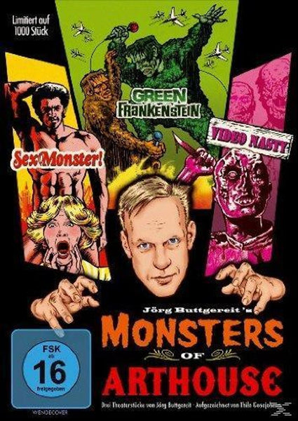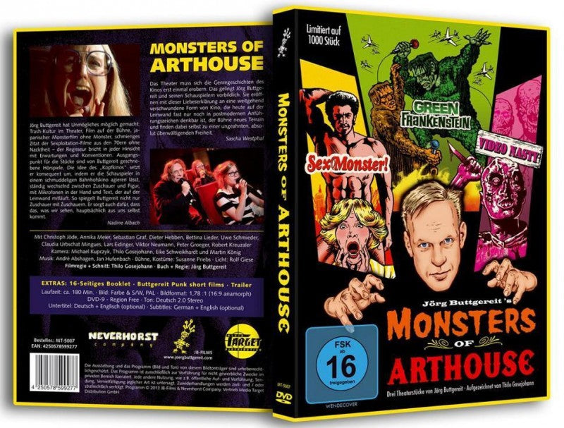 "Monsters of Arthouse" versammelt 3 Theaterstücke von Jörg Buttgereit auf einer DVD: "Green Frankenstein", "Sexmonster!" und "Video Nasty". In einem Grenzgang zwischen Live-Hörspiel, Theater und Film entführt Buttgereit die Zuschauer in die Welt der Bahnhofskinos der 70er Jahre, die mit ihren Nonstop Monster-, Sex- und Zombie-Filmen einen zwielichtigen Ruf genossen. Wie schon bei "Captain Berlin versus Hitler" hat Thilo Gosejohann die Bühnen-Exzesse von Jörg Buttgereit filmisch in Szene gesetzt. Ein Erlebnis der besonderen Art erwartet die Zuschauer, bei dem Zombies unter Kannibalen wandeln, Penis-Transplantationen aus dem Ruder laufen und japanische Riesenmonster lustvoll Städte zermalmen.