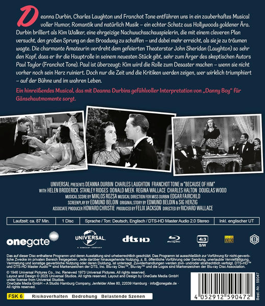Deanna Durbin, Charles Laughton und Franchot Tone entführen uns in ein zauberhaftes Musical voller Musik, Humor und Romantik – ein echter Schatz aus Hollywoods goldener Ära. Durbin brilliert als Kim Walker, eine ehrgeizige Nachwuchsschauspielerin, die mit einem cleveren Plan versucht, den großen Sprung an den Broadway zu schaffen – und dabei mehr erreicht, als sie je zu träumen wagte. Die charmante Amateurin verdreht dem gefeierten Theaterstar John Sheridan (Laughton) so sehr den Kopf, dass er ihr die Hauptrolle in seinem neuesten Stück gibt, sehr zum Ärger des skeptischen Autors Paul Taylor (Franchot Tone). Paul ist überzeugt: Kim wird die Rolle zum Desaster machen – wenn sie nicht vorher noch sein Herz ruiniert. Doch nur die Zeit und die Kritiken werden zeigen, wer wirklich triumphiert – auf der Bühne und im wahren Leben. Ein hinreißendes Musical, das mit Deanna Durbins gefühlvoller Interpretation von „Danny Boy“ für Gänsehautmomente sorgt.