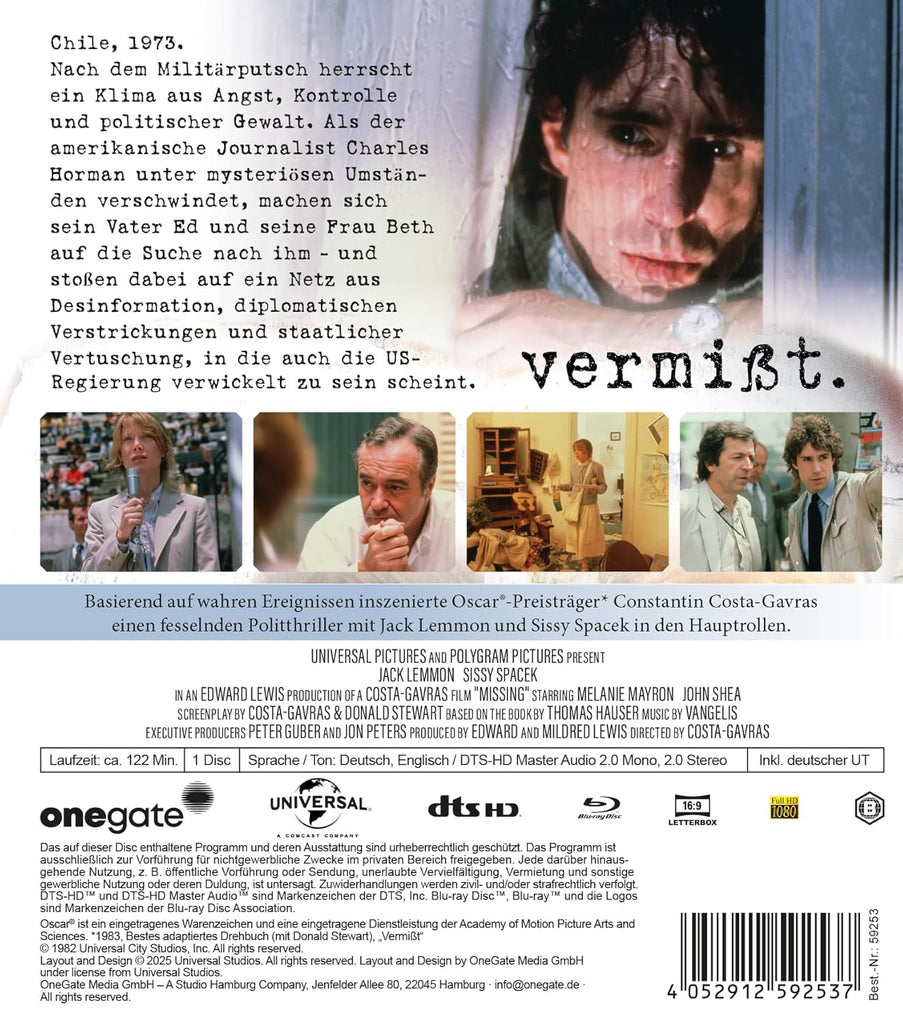 Basierend auf wahren Ereignissen inszenierte Oscar®-Preisträger Constantin Costa-Gavras mit "Vermisst" einen fesselnden Politthriller mit dem mehrfachem Oscar®-gekrönten Jack Lemmon und Oscar®-Preisträgerin Sissy Spacek in den Hauptrollen und gewann 1982 die goldene Palme von Cannes für den besten Film.
